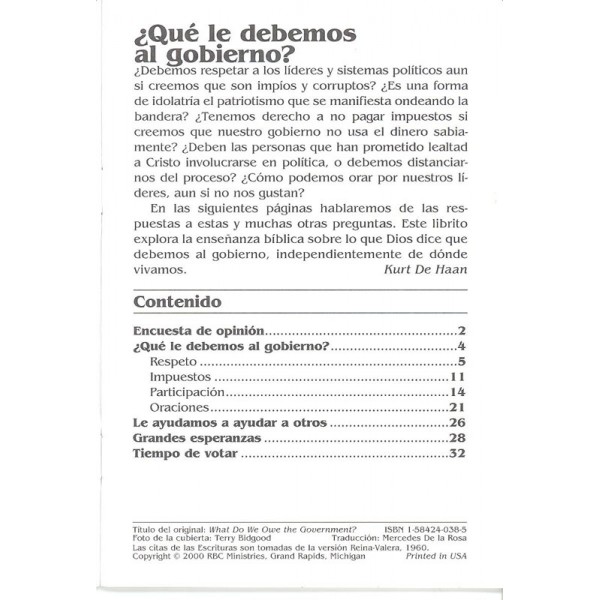 En las siguientes páginas hablaremos de las respuestas a estas y muchas preguntas, este librito explora la enseñanza bíblica sobre lo que Dios dice que debemos al gobierno, independiente de donde vivamos.